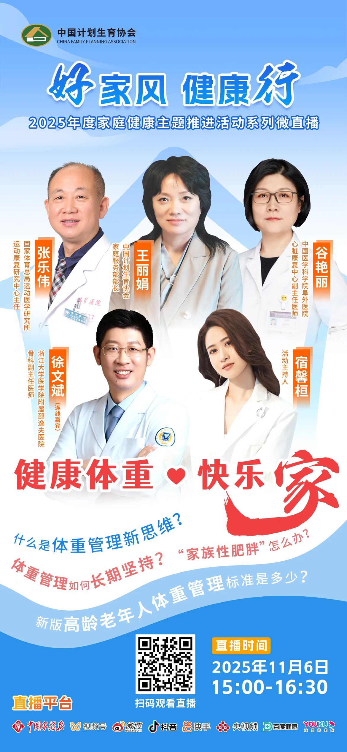 11月6日15:00—16:30,由中国计生协、全国爱卫办、农业农村部、国家卫生健康委、国家中医药局、全国妇联等部门联合主办,中国家庭报社承办的2025年度“好家风·健康行”家庭健康主题推进活动——系列微直播,第三期节目《健康体重·快乐家》即将开启!这场专为家庭健康体重管理量身定制的“云端课堂”,将以科学权威的解读助广大网友及家人找到“健康体重”的钥匙!