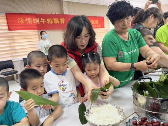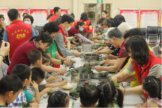 当日一早,省计生协的党员志愿者们深入石家庄市新华区革新街道天骄社区,与社区居民一起准备糯米、蜜枣、粽叶、棉线等,共包粽子,喜迎端午。卷筒、填米、放枣、裹紧、扎绳……党员志愿者们与社区居民、老党员、亲子家庭欢聚一堂,一边热闹地交流包粽子的技巧,一边讲政策、话家常,宣传生育政策,传播健康生活理念,倡导优生优育、适龄婚育、孝老爱亲、代际和谐的新时代婚育文化。浓浓的节日氛围拉近了党员志愿者与社区居民的关系。