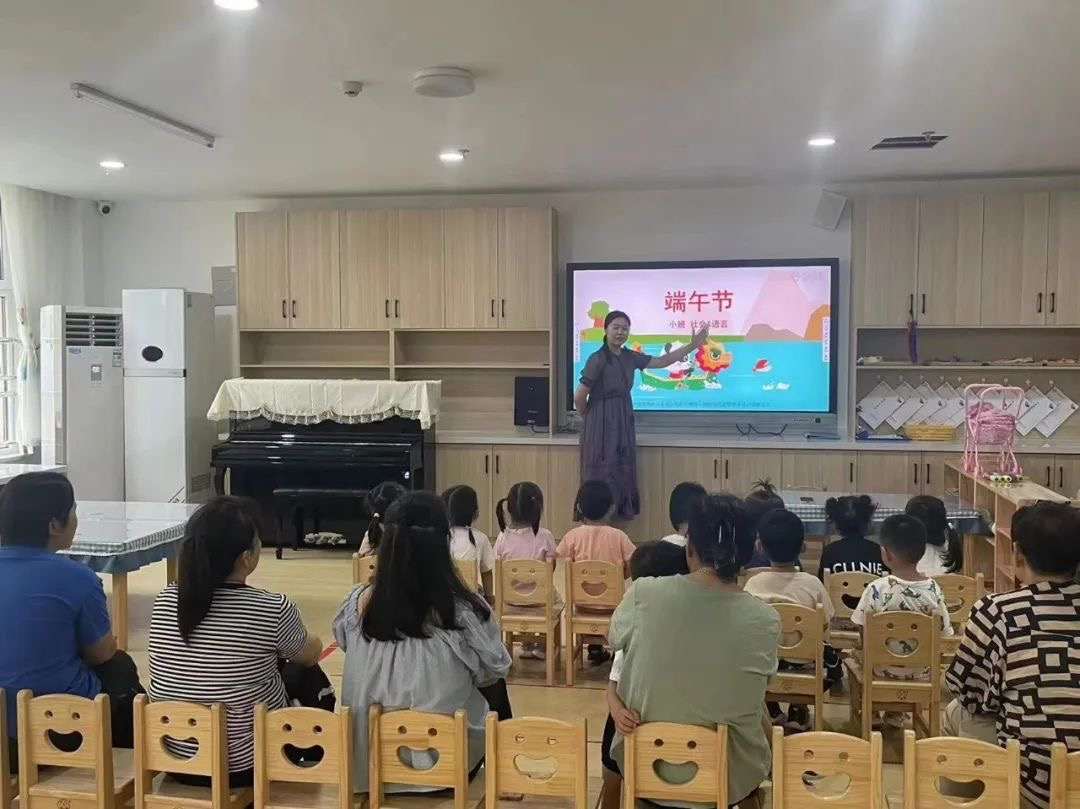 工作人员向小朋友们讲解端午节的由来和习俗。老师和家长们为孩子制作寓意驱邪、祈福纳吉的五彩小手绳。大家还一起将艾蒿悬挂在教室里,一起包粽子。
