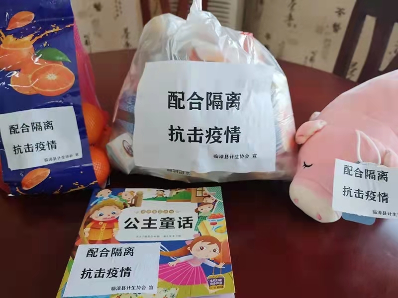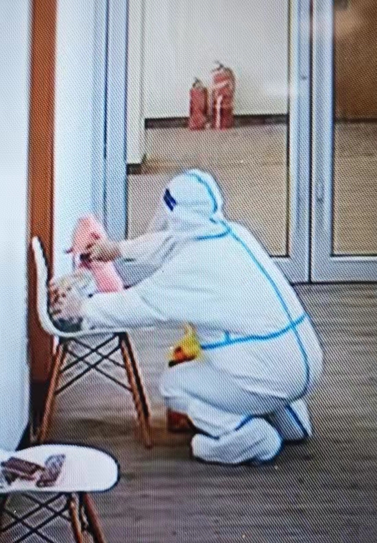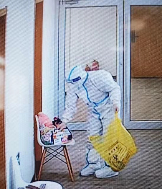 图为视频截图,工作人员将玩具和书籍摆放在交接位置