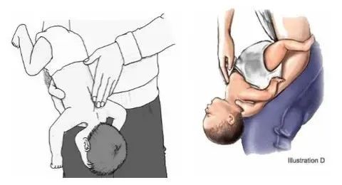 将婴儿俯卧在家长的前臂上,头部朝下,注意用手支撑婴儿头颈部;用另一手掌掌根在婴儿背部两肩胛骨之间拍击5次。如果异物没有排出,使患儿平卧在家长大腿上,面向上,保持头低位,同样注意保护婴儿头颈,用另外一只手的两根手指压在宝宝的胸骨中间,进行5次胸部冲击按压。如果异物没有排出,反复整套动作直至异物排出。