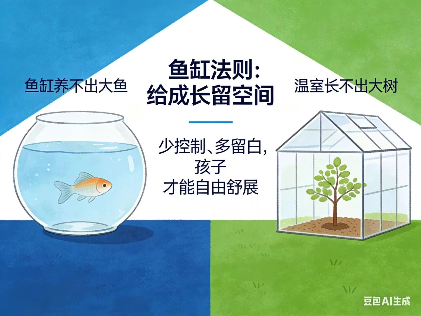 教育也一样,只有打破“鱼缸”,才能让孩子获得更多发展,孩子的成长需要自由的空间。家长在确保安全的前提下,逐步放手。让孩子自己尝试穿衣、收拾书包、安排周末半天的时间,允许他犯一些非原则性的错误,并从自然结果中学习。