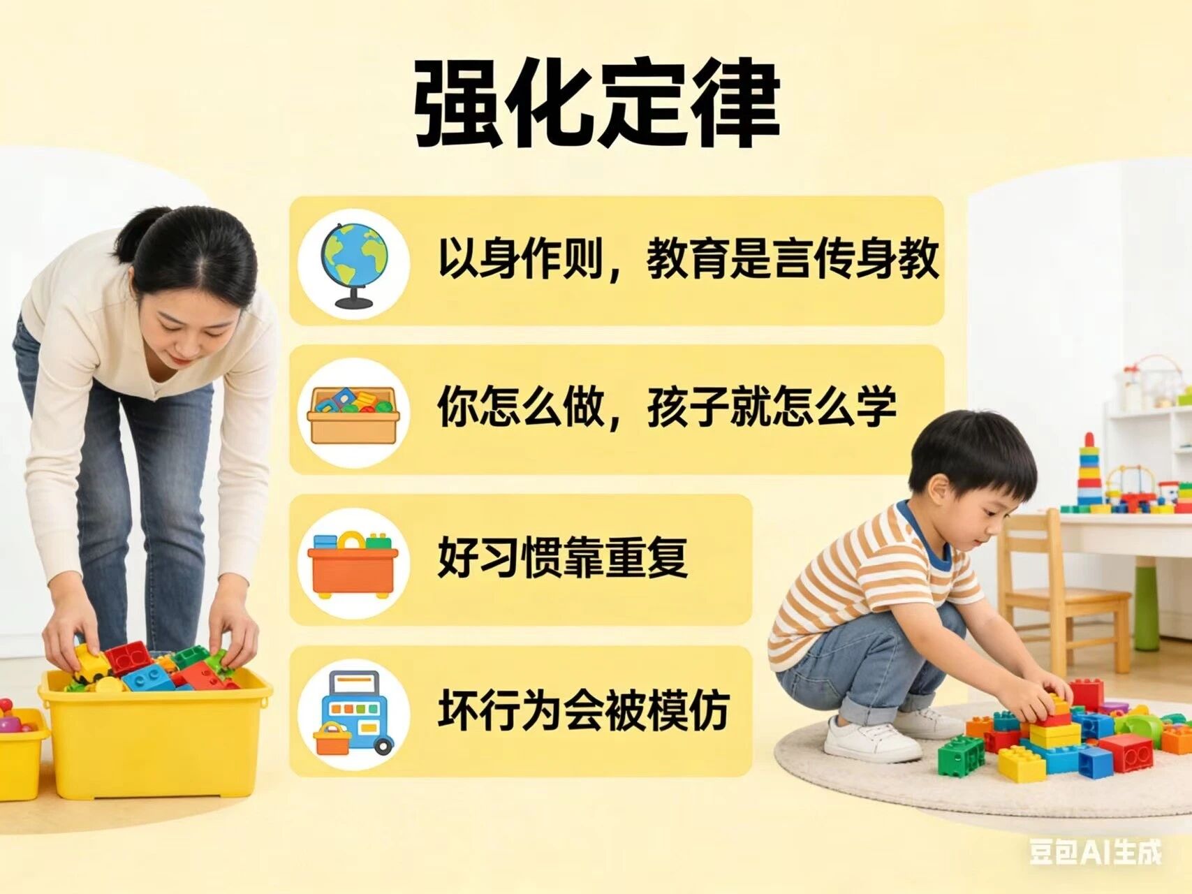 孩子行为的结果决定了它是否会重复发生。得到正面强化的表扬、奖励会重复出现;而被忽视或惩罚的行为会逐渐消失,正面激励远比负面惩罚有效。在抓住孩子做得好的瞬间进行具体表扬。“你今天主动收拾了玩具,让家里很整洁,真棒!”,强调主动收拾,减少对不良行为的过度关注,有时“忽视”本身就是一种消退。