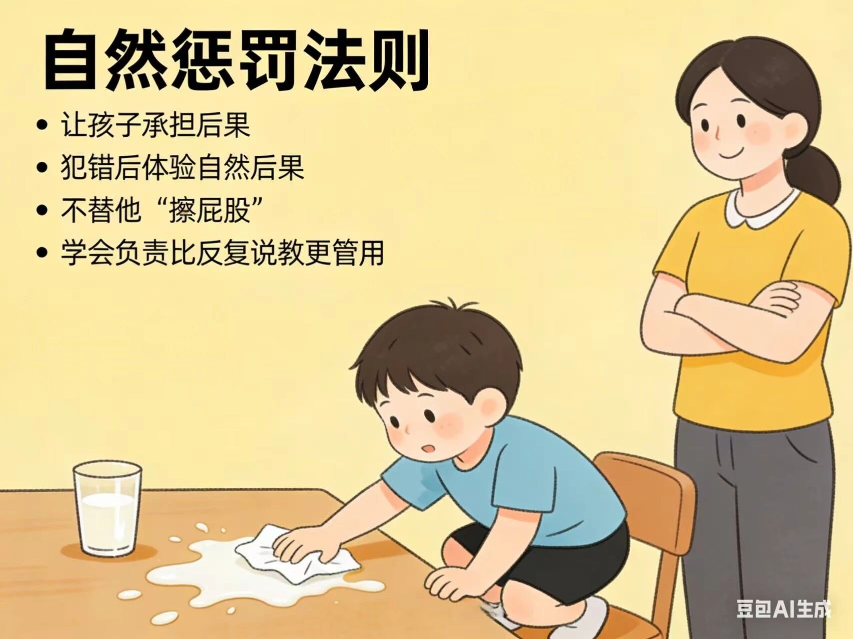 让孩子从行为的自然结果中获得经验和教训,而不是由父母来施加人为的惩罚。这能培养孩子的内在责任感。比如孩子不愿吃饭,不必追着喂,让他体验饥饿的自然结果,下一餐之前没有零食。如果孩子拖延作业,不必催促,让他明天自己去面对老师的自然结果。孩子会在这个过程当中吸收教训,获得成长。