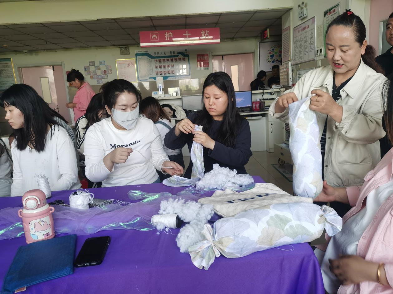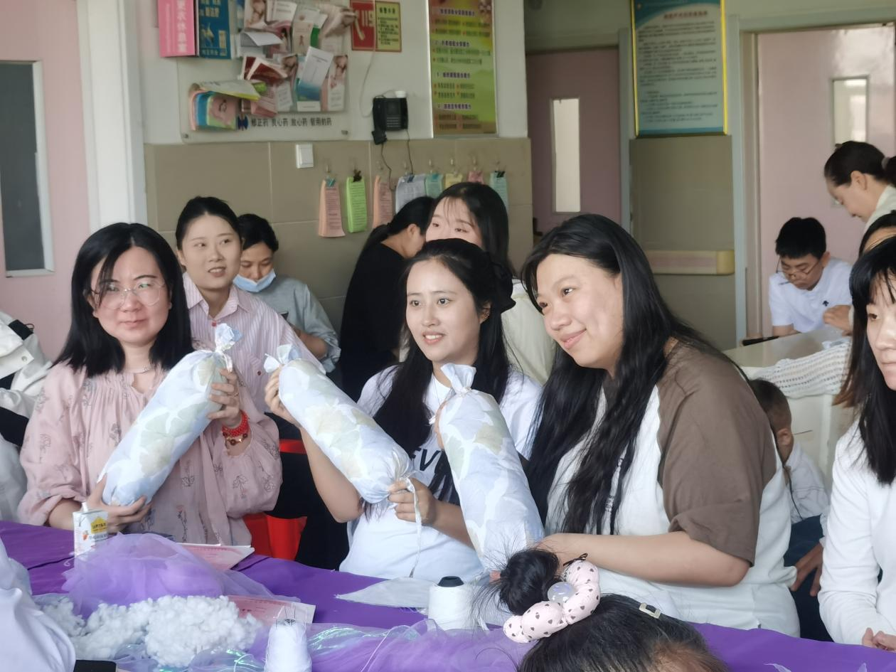 科普讲解环节结束后,现场开启了温馨的手工制作环节。在医护人员和工作人员的指导下,孕妈妈们穿针引线,亲手为腹中宝宝缝制专属糖果枕。一针一线饱含着对宝宝满满的爱意与期盼。大家互相交流心得、分享孕期感受,在轻松治愈的手工过程中缓解了孕期焦虑,也感受到为人母的幸福与喜悦。