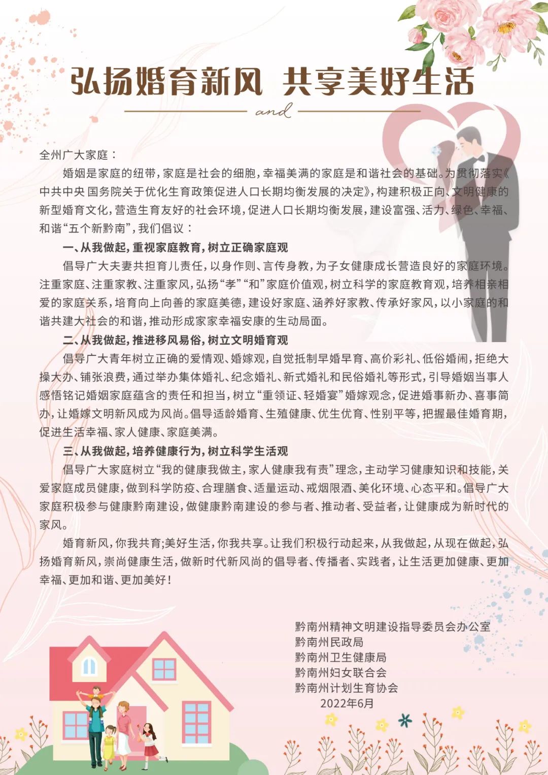 婚姻是家庭的纽带,家庭是社会的细胞,幸福美满的家庭是和谐社会的基础。中国计生协新型婚育文化建设试点——贵州省黔南州计生协近日联合州文明办、民政局、卫健委、妇联发布《弘扬婚育新风 共享美好生活》倡议书,号召广大家庭做新时代婚育新风尚的倡导者、传播者、实践者,营造生育友好的社会环境,促进人口长期均衡发展。